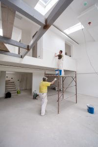 construction worker using scaffold while plastering